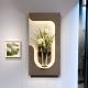 اللوحة تأتي بشكل منحني أنيق مع مزهرية زجاجية شفافة تحتوي على نباتات خضراء وزهور بيضاء تضفي حياةً وجمالاً طبيعياً على الجدار.
