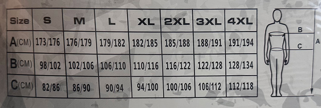 S (46) – M (48, 50) – L (52, 54) – XL (56, 58) – XXL (60, 62) – XXXL (64, 66) – 4XL (68, 70)